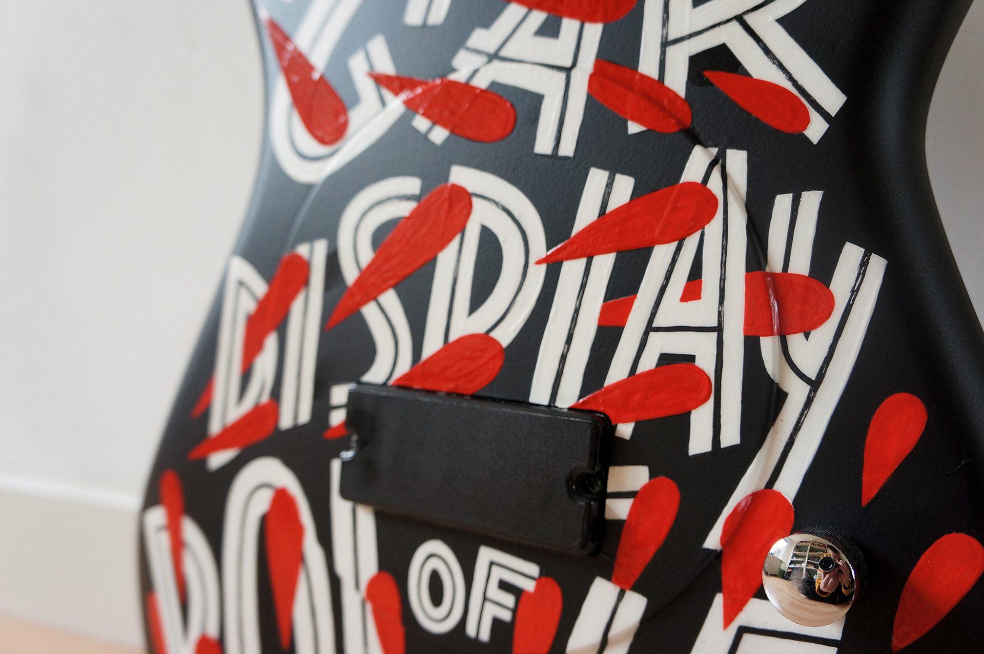 I had the honour of painting this bass guitar, the instructions were that it had to be inspired by the cover of Pantera's 1992 album 'Vulgar display of Power'. The cover shows a black and white picture of man being punched in the face and some blood red type. I decided to approach this typographically, and translated the motions of being punched into the movement of the letters. And of course, what is a good punch without some blood.