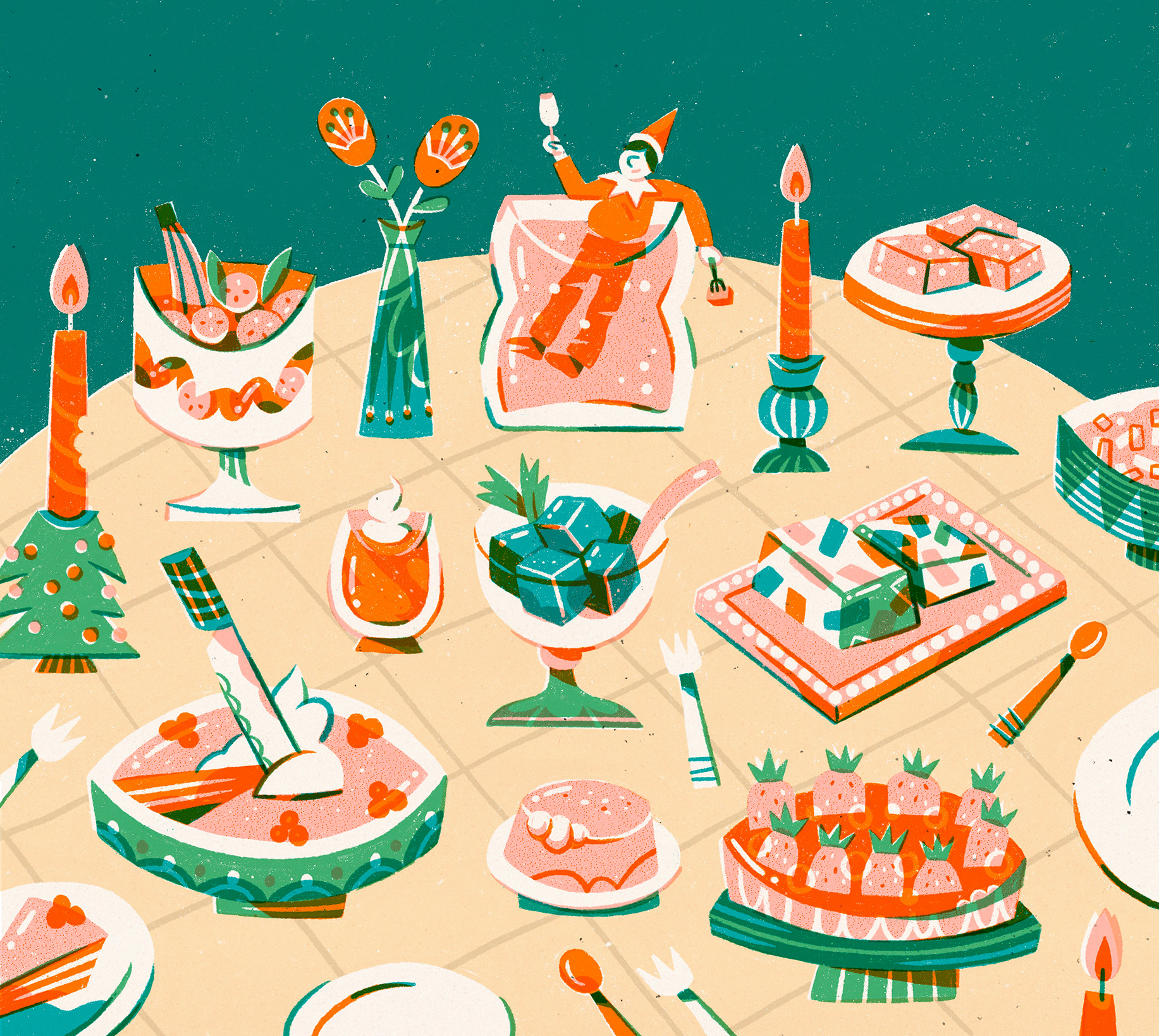 A set of illustrations to accompany a recipe article by Alex Beggs on the Block Party website about holiday desserts. AD: Sarah Ceniceros Gomez