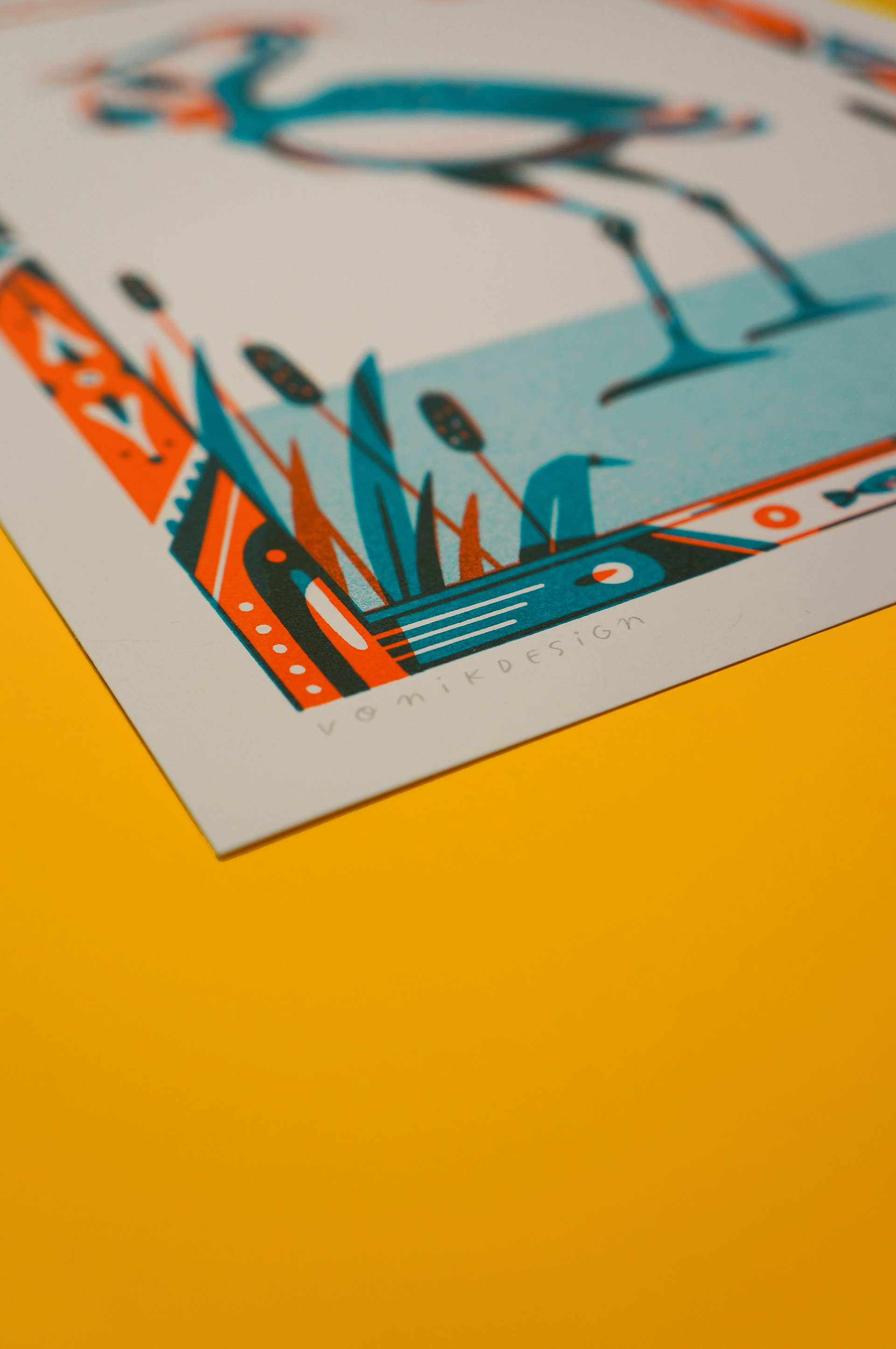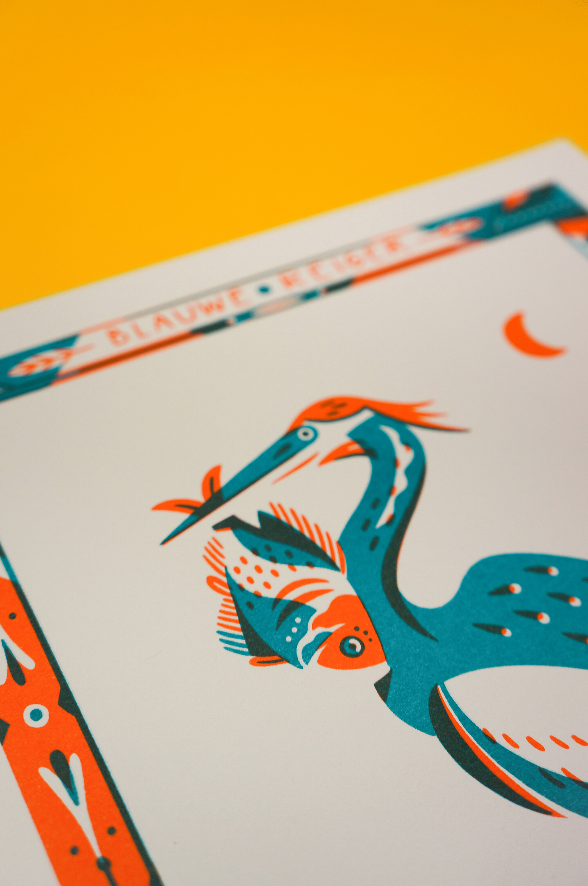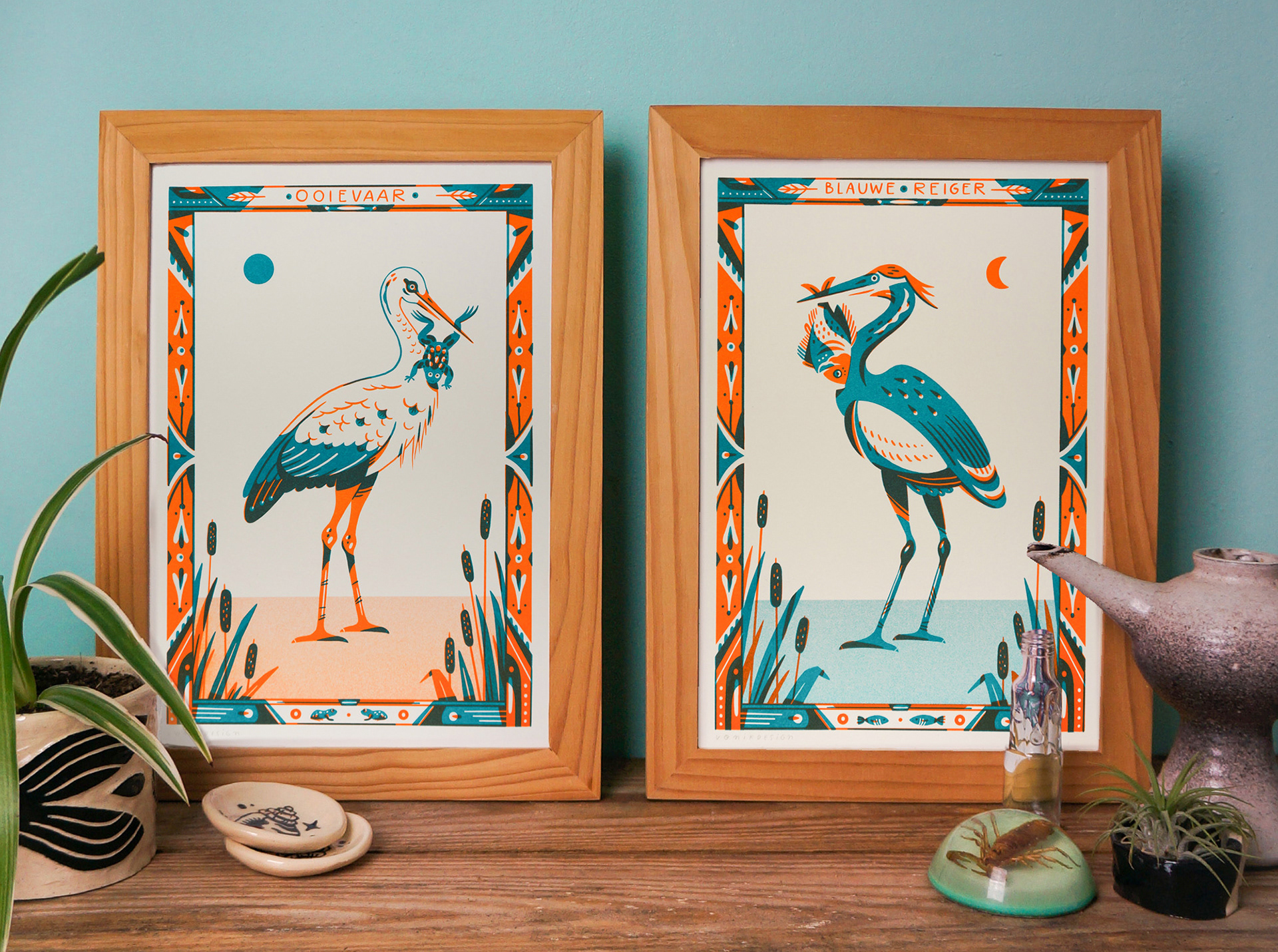 Personal work • Two of my favourite birds, the Heron and the Stork. The first edition was a red and blue colour combo, the second run is teal and orange. These A4 prints are available in my webshop.