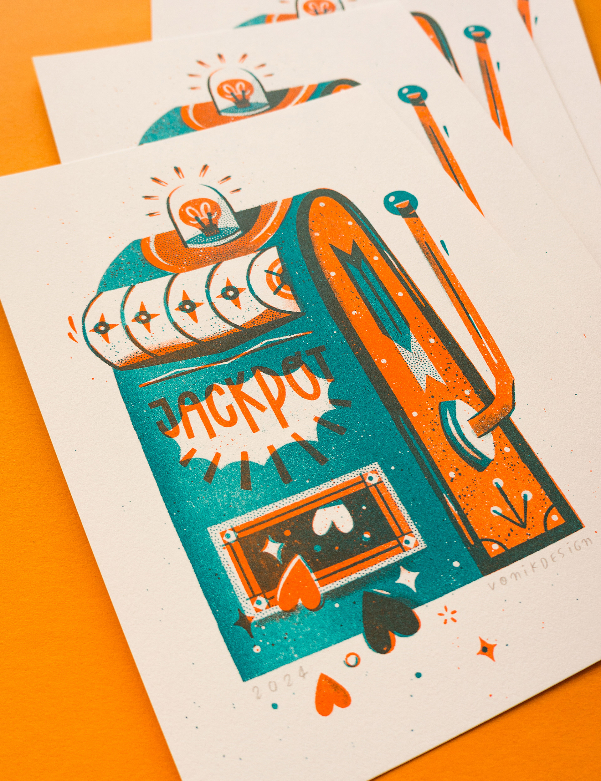 Lucky in love. The design is made as an A5, two-color (orange & light teal) riso print and is available in